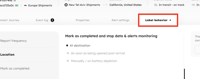 Label-Verhalten: Auf dem Tab „Label Behavior“ sehen Sie die Gerätekonfiguration, die die Sendung vom Set übernimmt.
